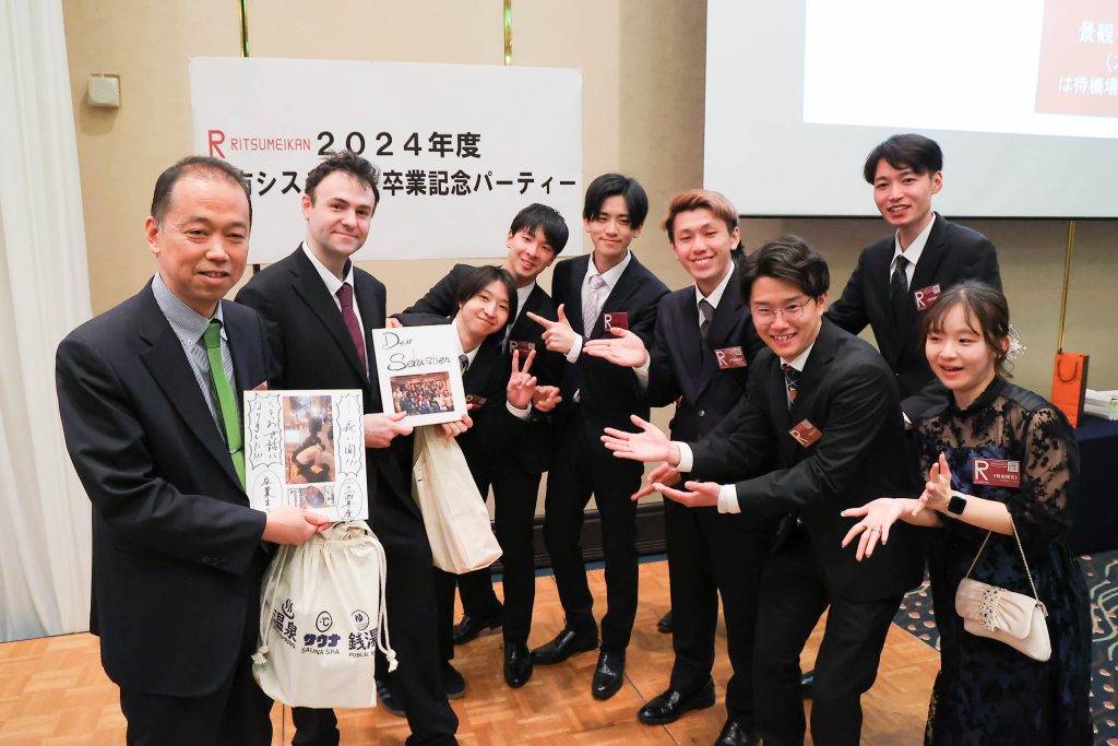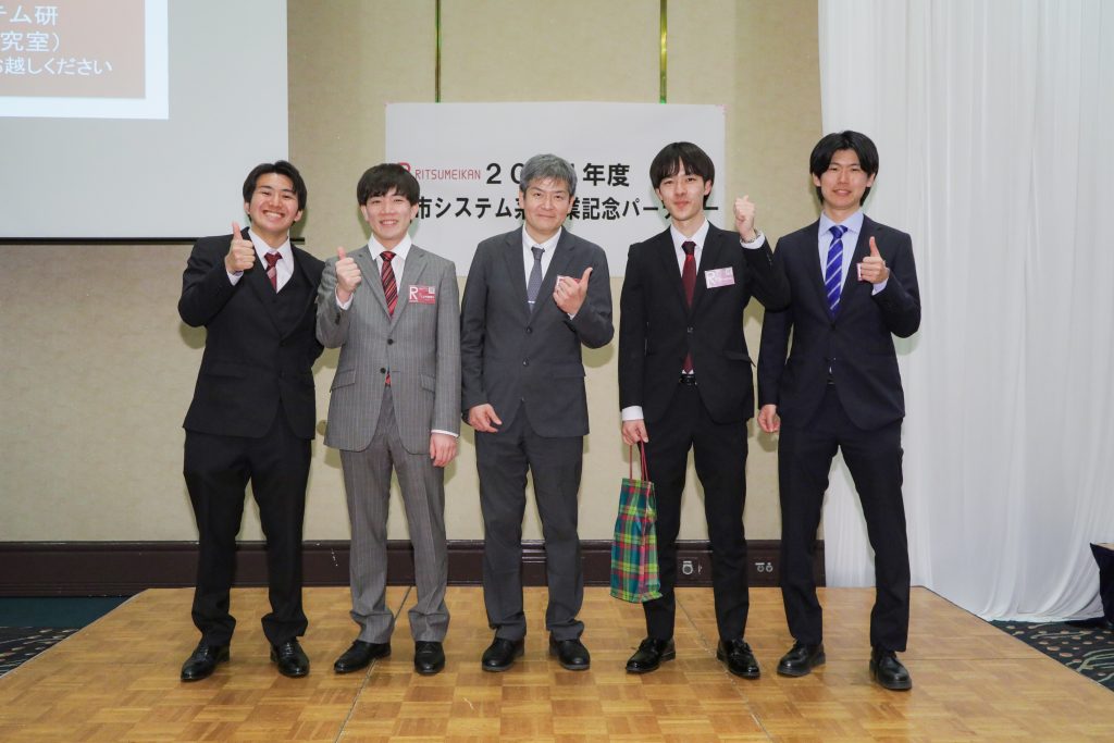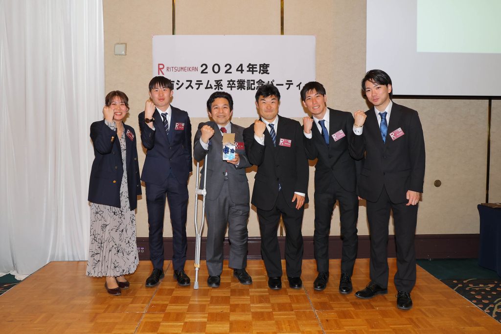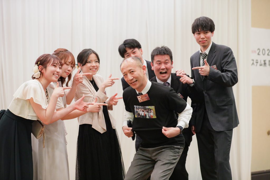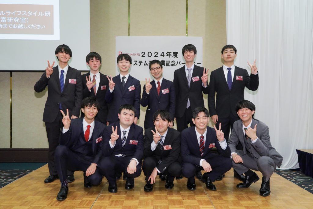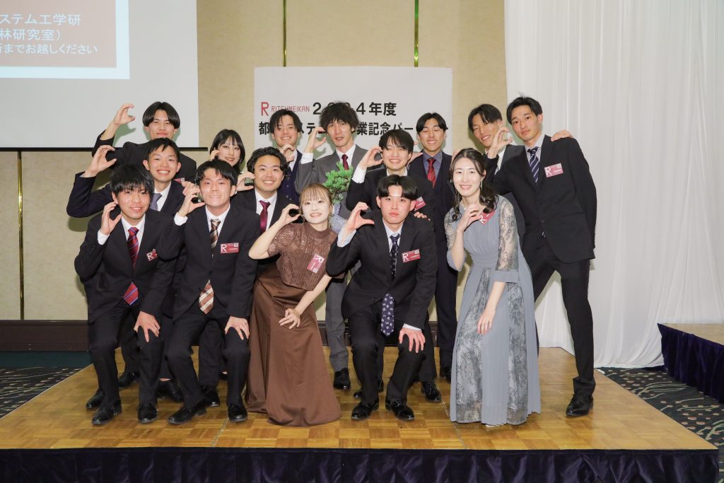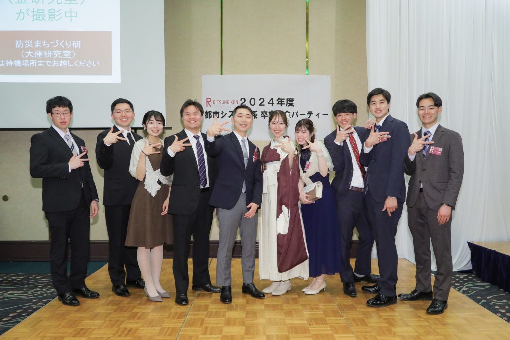 卒業式、学位記授与式の終了後、卒業パーティの場で研究室ごとの記念集合写真を撮影しました!