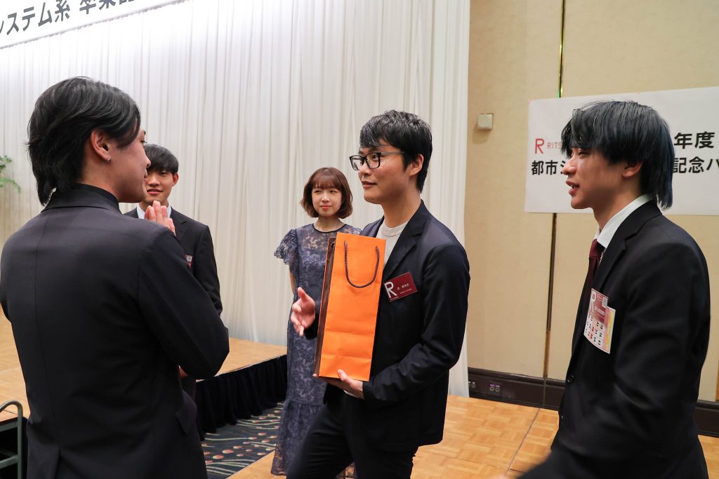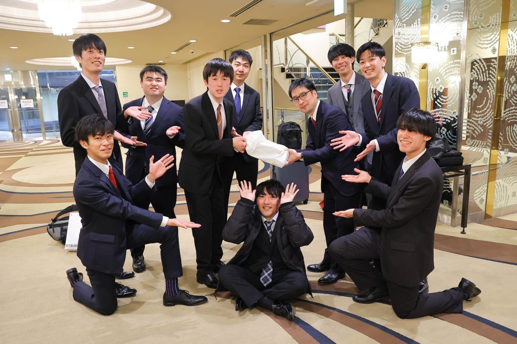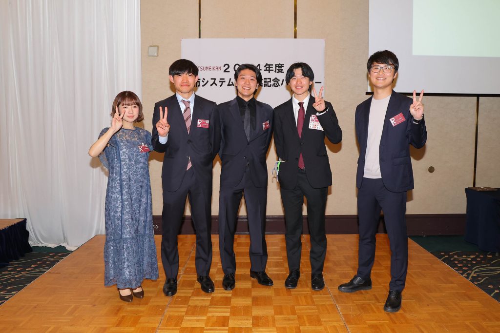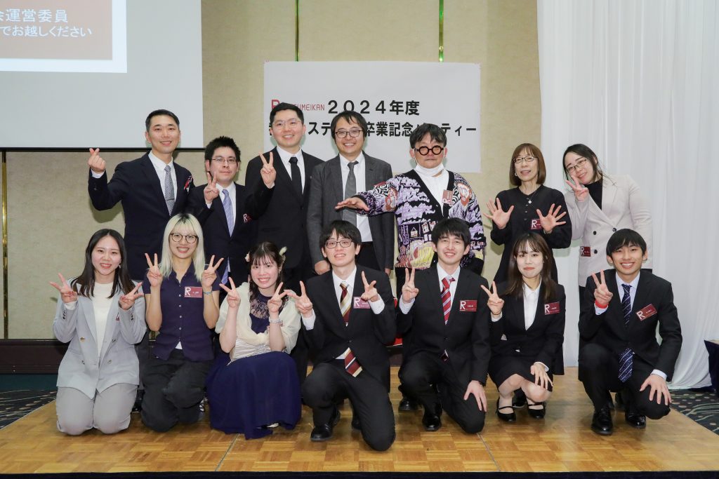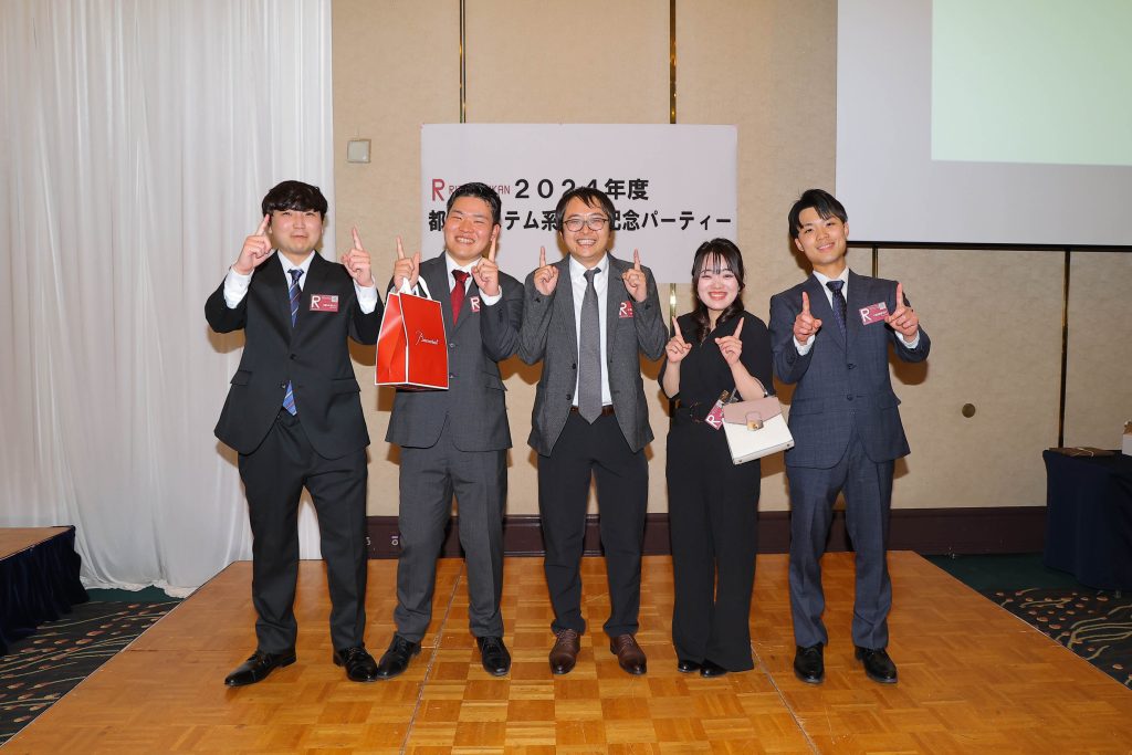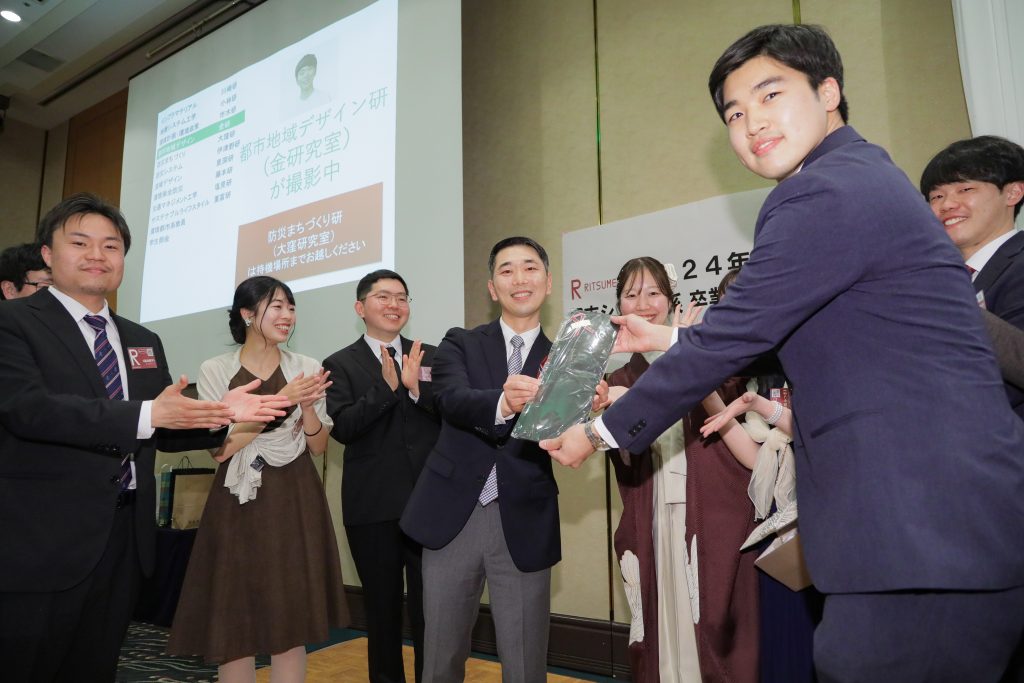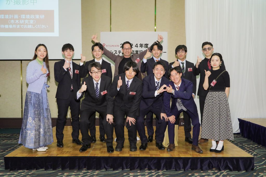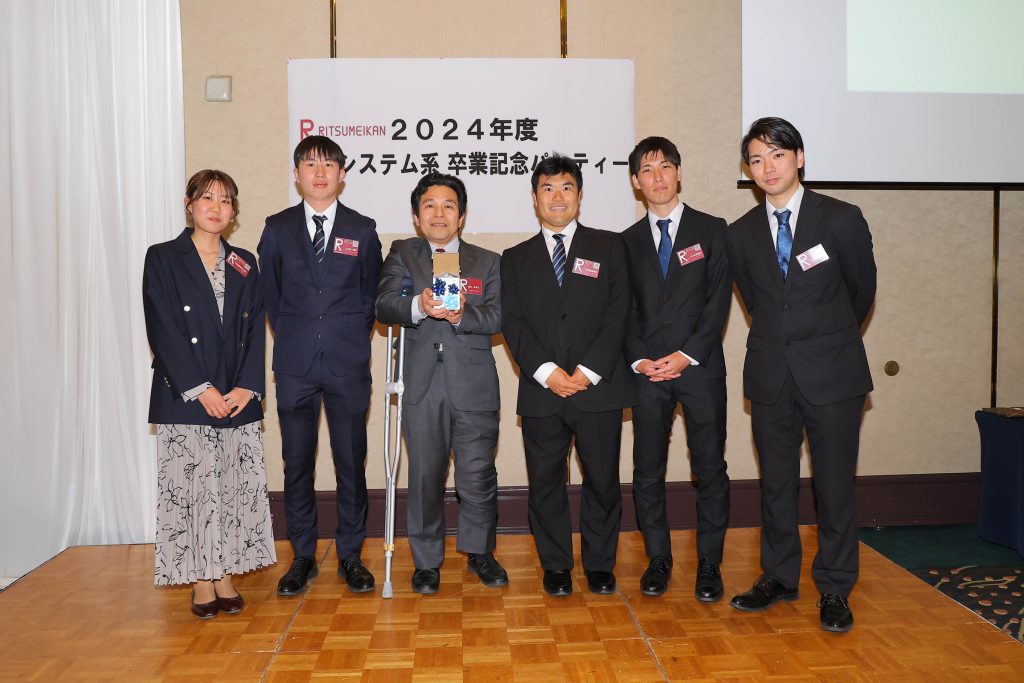 卒業式、学位記授与式の終了後、卒業パーティの場で研究室ごとの記念集合写真を撮影しました!